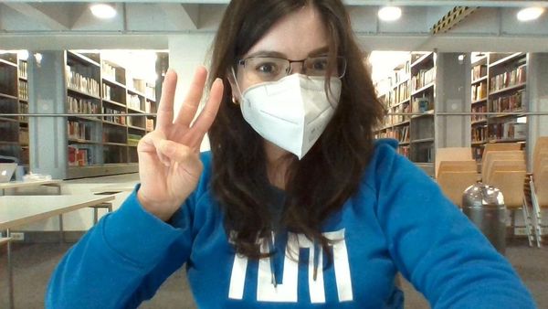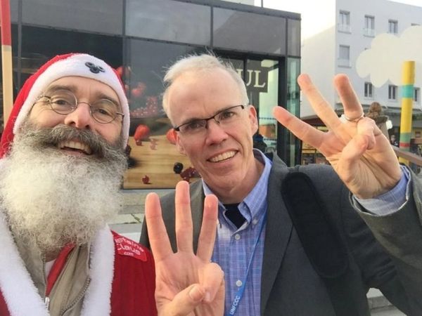 Young Doctor Shalabi and friend share 3 finger Sustainability Symbol with SustainaClaus