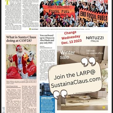 SustainaClaus, Joha and the Sustainies, Roger the Reality Rooster and Low Carbon A-I-Panda are “dealing in Peace” (not violence) this holiday season