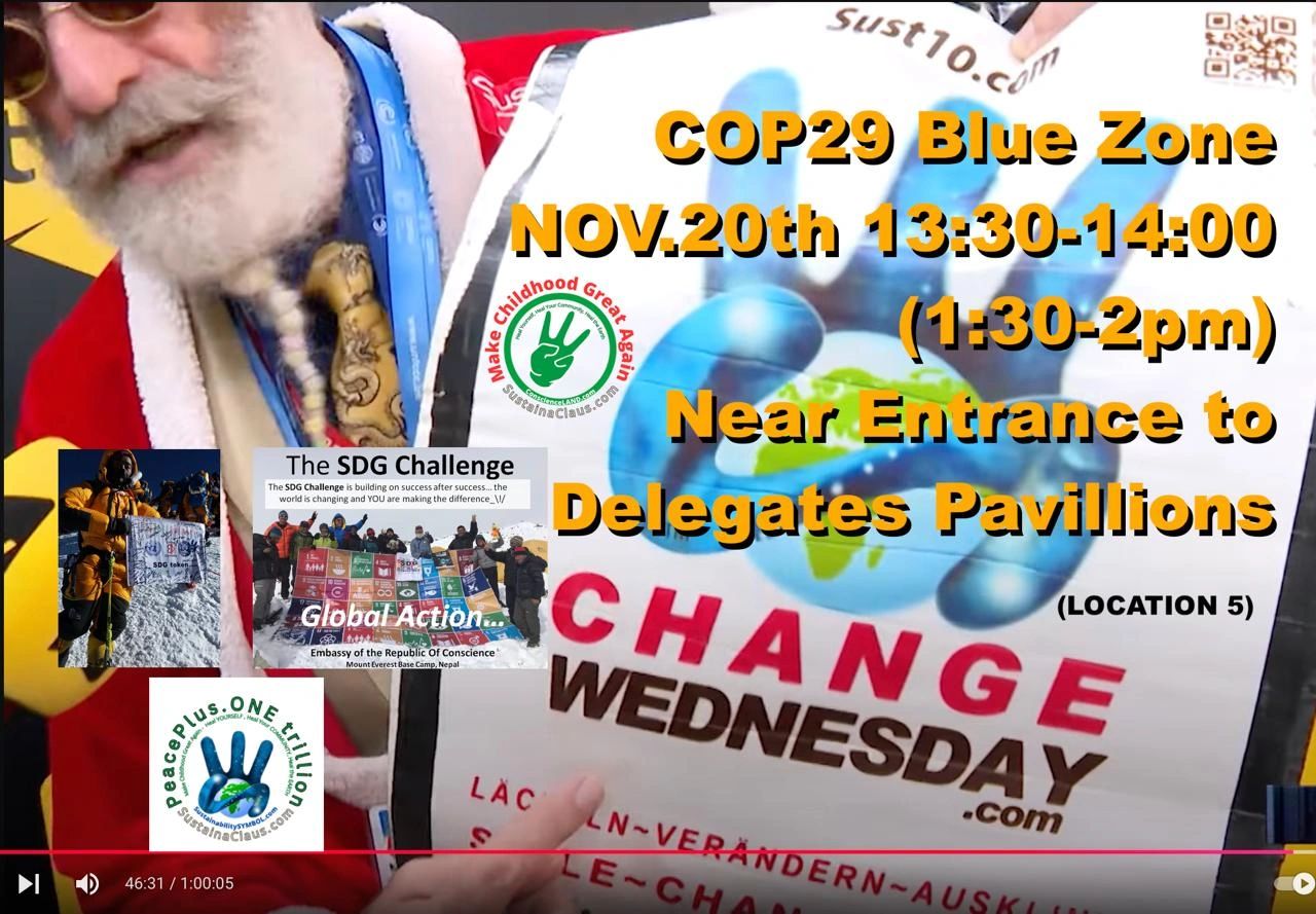 PeacePlus.ONE Join the FUN at COP29 in Baku Azerbaijan, SustainaClaus will bring the SDG EVEREST Banners to update what Civil Society is doing to heal humanity. Join us from 13:30 to 14:00 next to the entrance to Delegates Pavilions