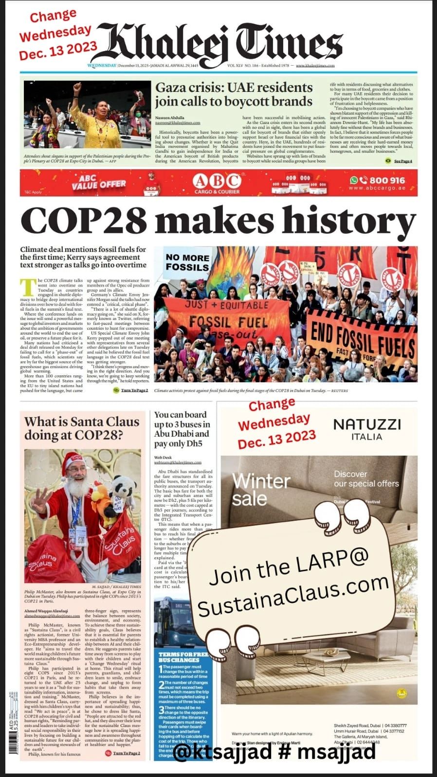 SustainaClaus made the front page of the Khaleej TImes in Dubai UAE.